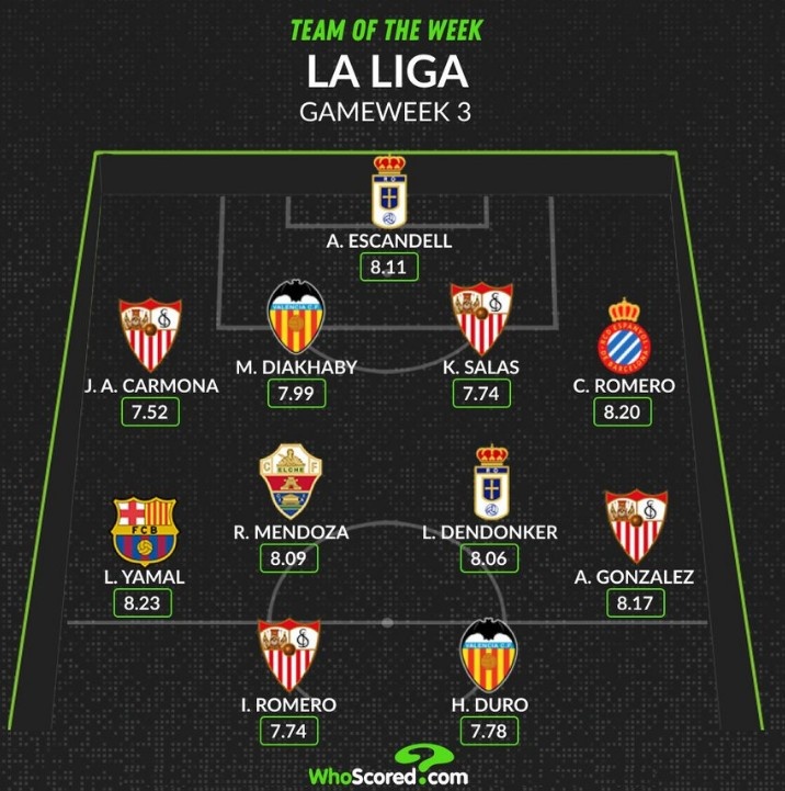 直播吧9月1日讯 本轮西甲战罢,数据网站Whoscored也评出本轮西甲最好阵,其中亚马尔领衔入选,具体如下:
