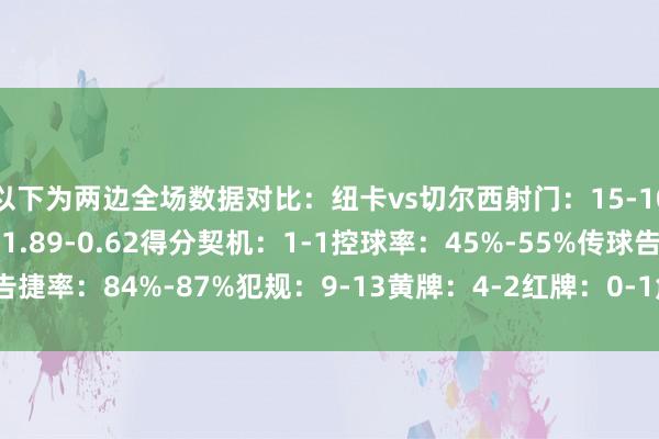 以下为两边全场数据对比:纽卡vs切尔西射门:15-10射正:6-3预期进球:1.89-0.62得分契机:1-1控球率:45%-55%传球告捷率:84%-87%犯规:9-13黄牌:4-2红牌:0-1角球