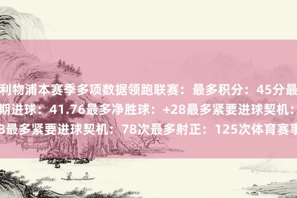 利物浦本赛季多项数据领跑联赛:最多积分:45分最多进球:45球最高预期进球:41.76最多净胜球:+28最多紧要进球契机:78次最多射正:125次体育赛事直播